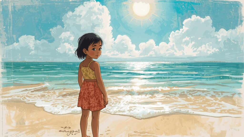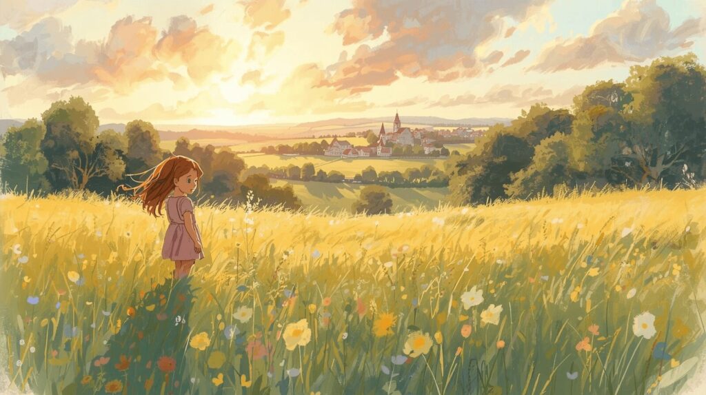 - 「草原に立つ少女、遠くに小さな村、夕暮れの逆光、やわらかいパステル調、手描きアニメ映画風でジブリっぽく」