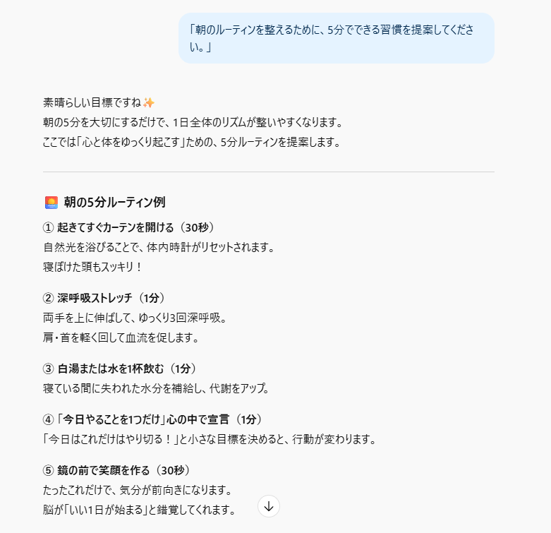 「朝のルーティンを整えるために、5分でできる習慣を提案してください。」