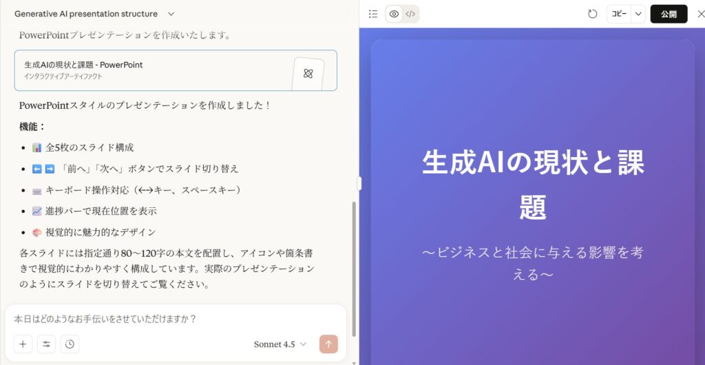 1. Claudeにテーマを入力して、5枚構成の資料を生成してみる