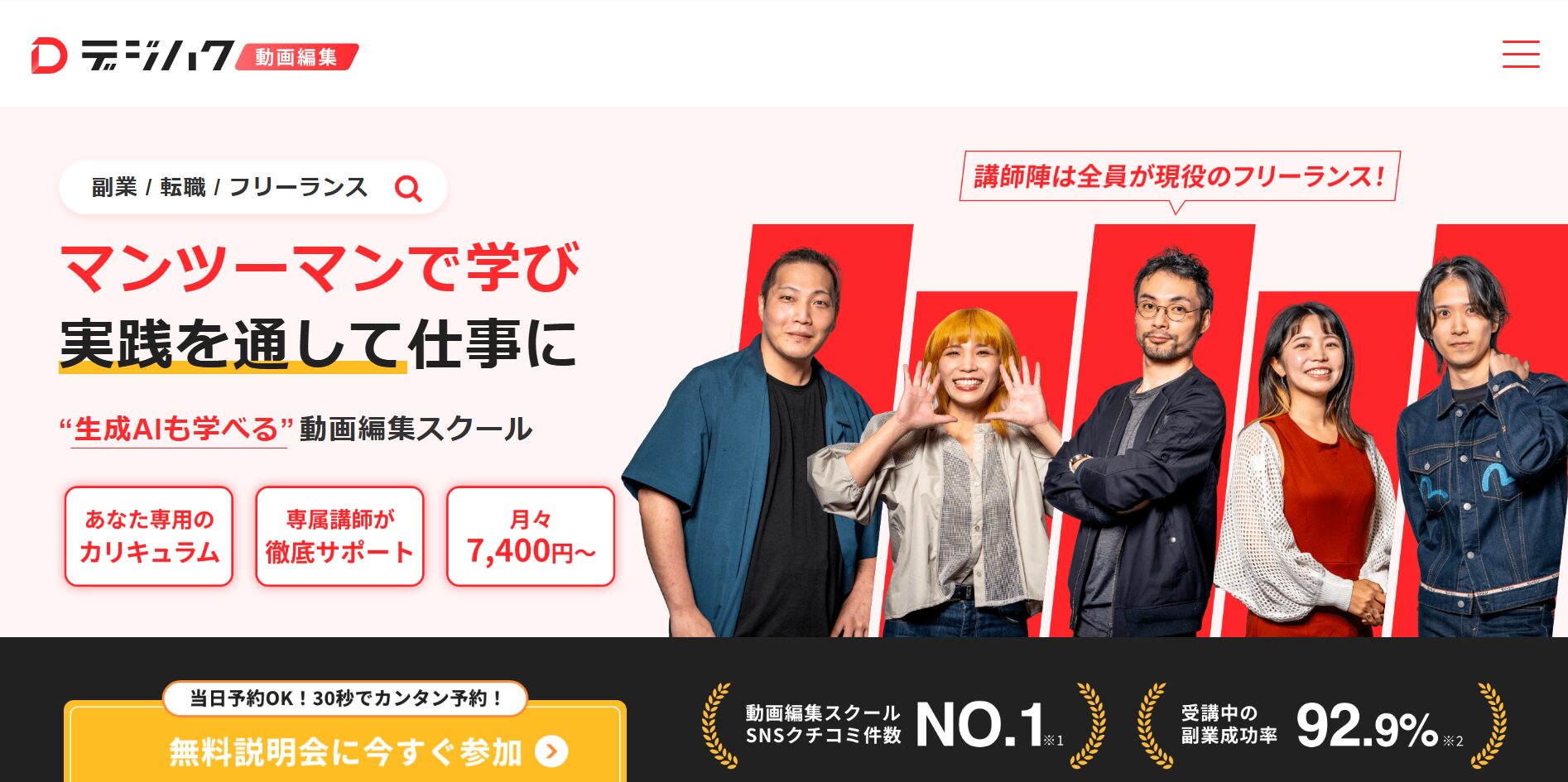 カリキュラムには、実案件に近い編集演習や営業テンプレート、ポートフォリオ作成支援が含まれており、卒業後も仕事を獲得できるよう設計されています。