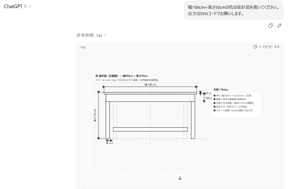 このように入力すると、ChatGPTは寸法・比率・線の整合性を考慮したSVGコードを生成します。